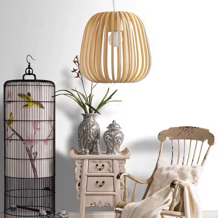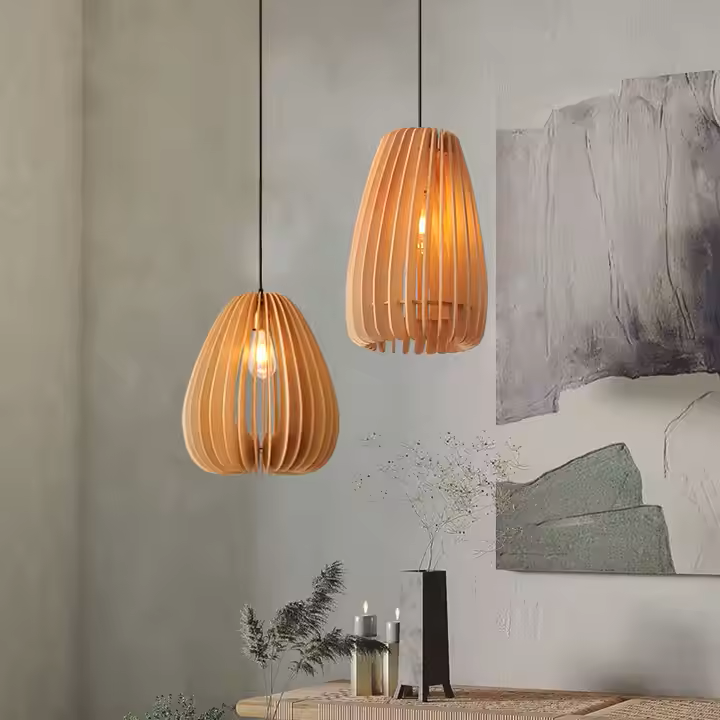 Colgante de madera con diseño de varillas, base E27, con diámetro de 310mm y altura de 370mm. Ideal para ambientes cálidos y naturales, este colgante es perfecto para iluminar comedores, salas o espacios con un toque rústico. Lamparita no incluida.