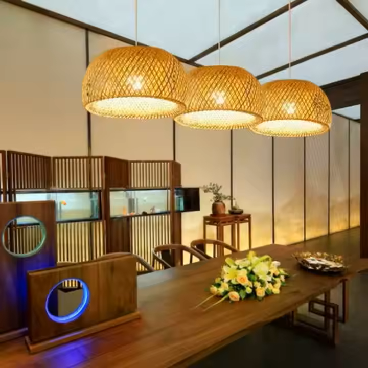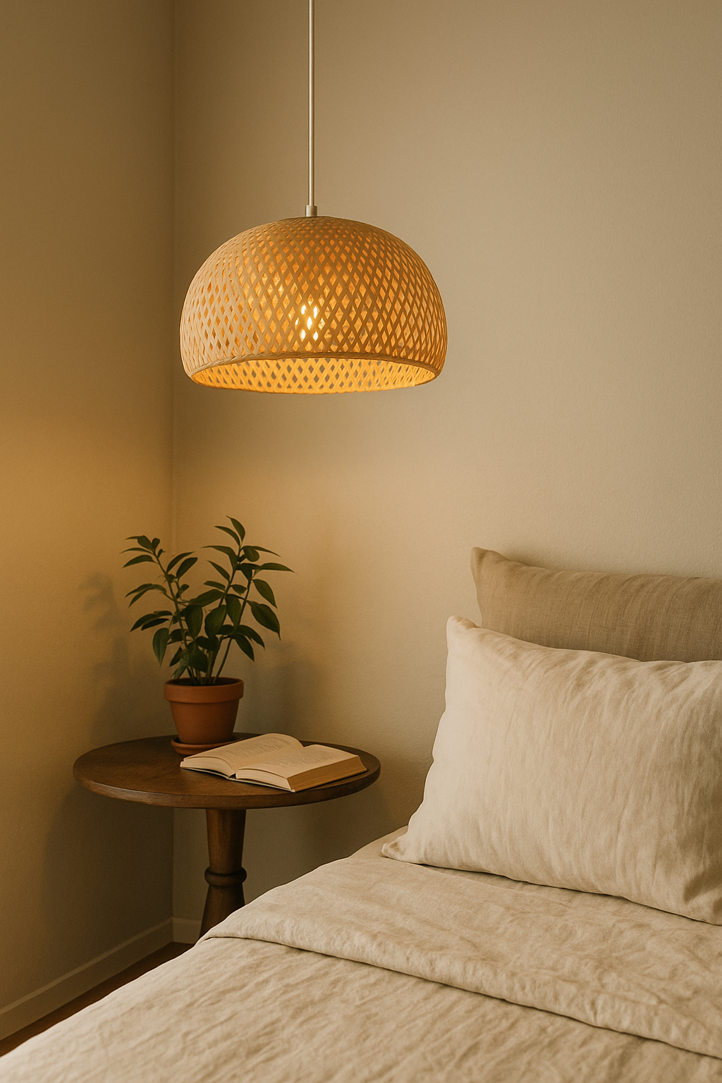 Colgante con diseño de campana en bambú, base E27. Con un diámetro de 365mm y altura de 195mm, este colgante aporta una luz cálida y suave, ideal para ambientes pequeños o de techos bajos, manteniendo una estética natural y moderna. Lamparita no incluida.