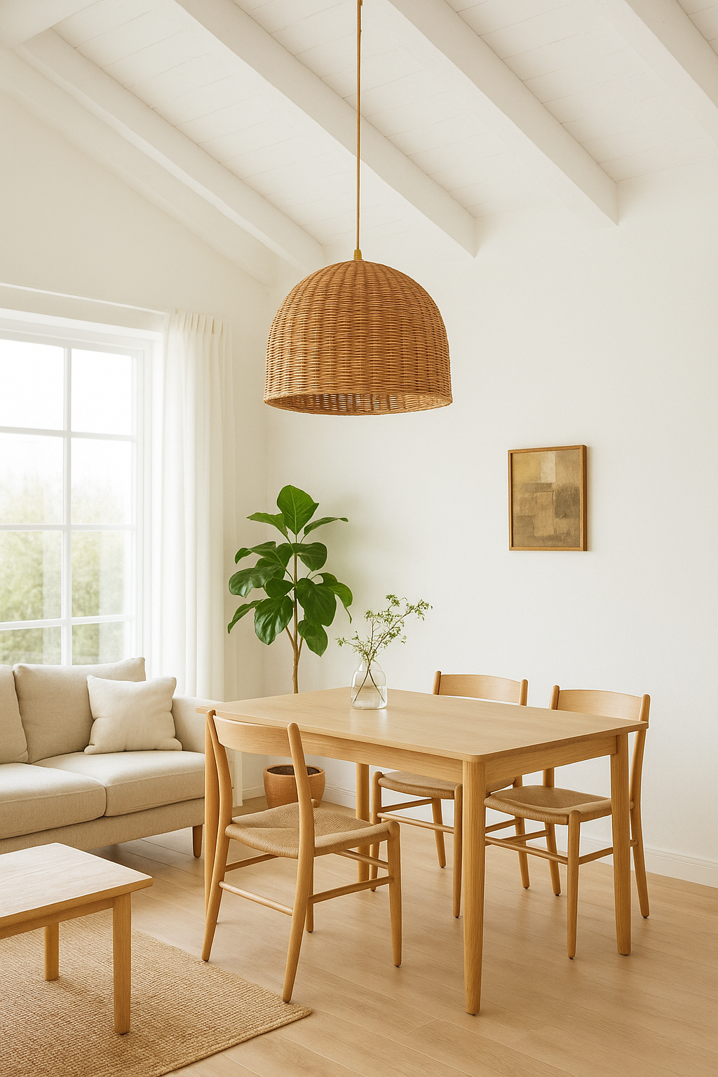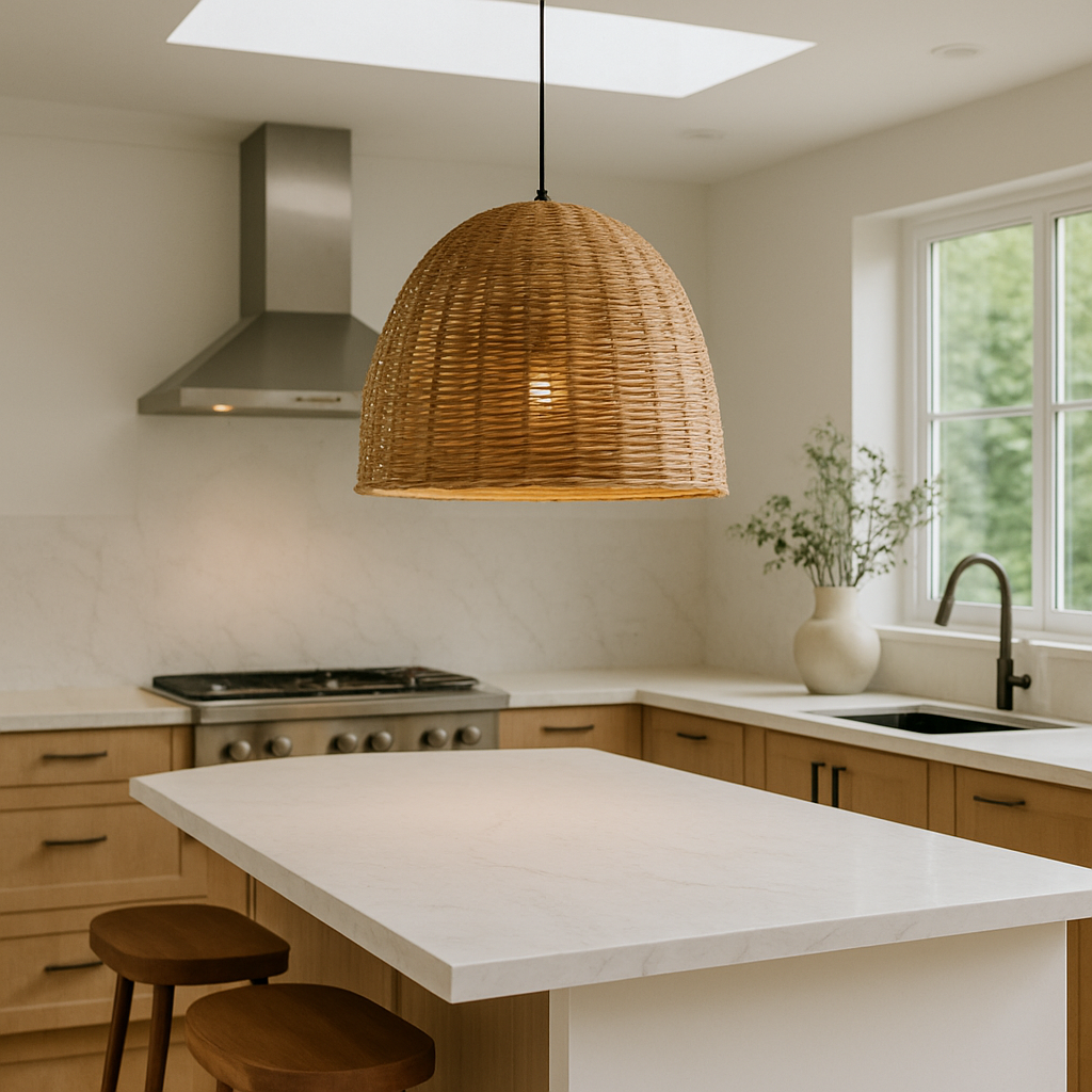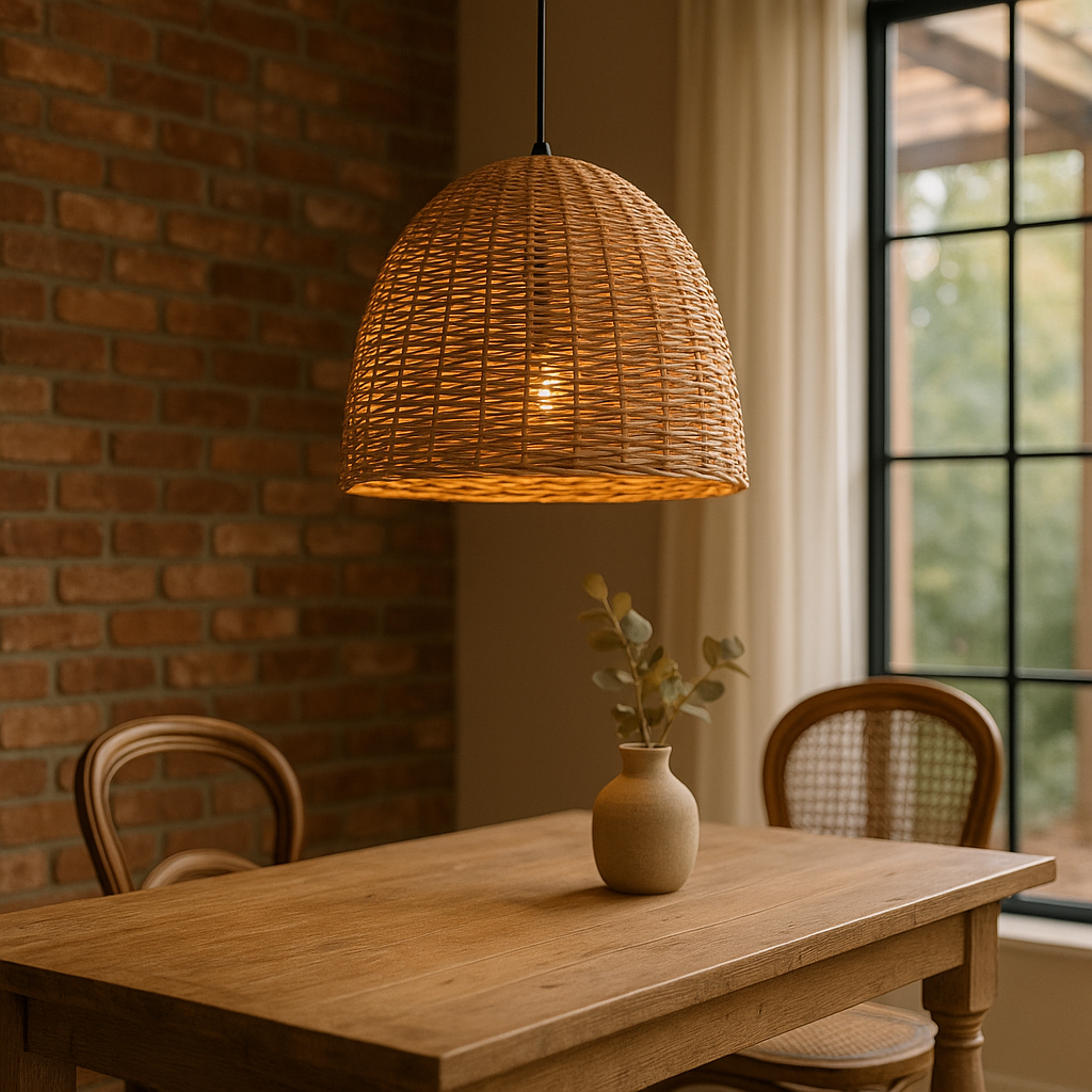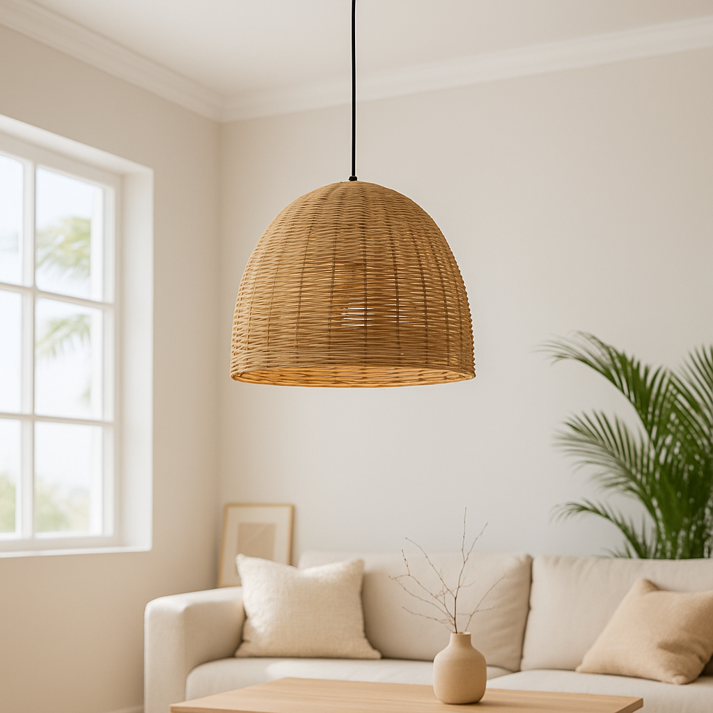 Colgante de campana en bambú con base E27. Su diámetro de 380mm y altura de 405mm lo convierten en una opción versátil para iluminar salas de estar, comedores o áreas de descanso, ofreciendo una iluminación cálida y natural. Lampara no incluida.