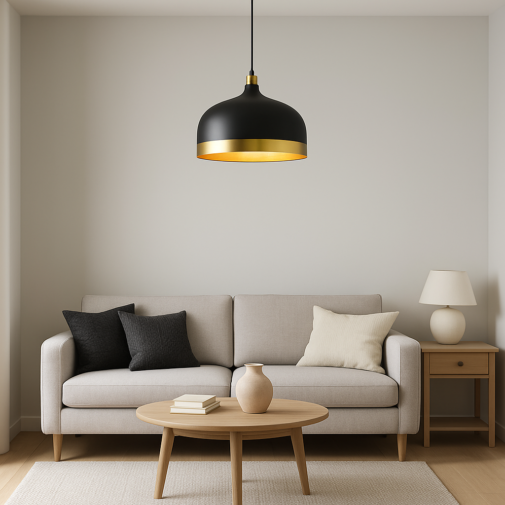 Colgante de campana en metal negro con detalles dorados, base E27, de 420mm de diámetro. Este diseño sofisticado y elegante es ideal para añadir un toque de lujo y calidez a cualquier espacio moderno o de estilo industrial. Lamparita no incluida.