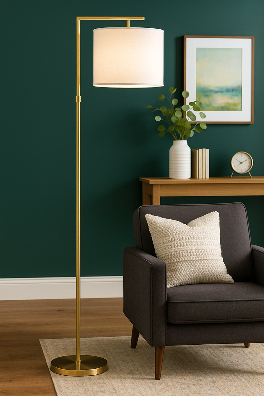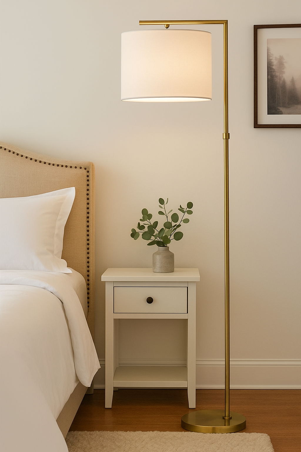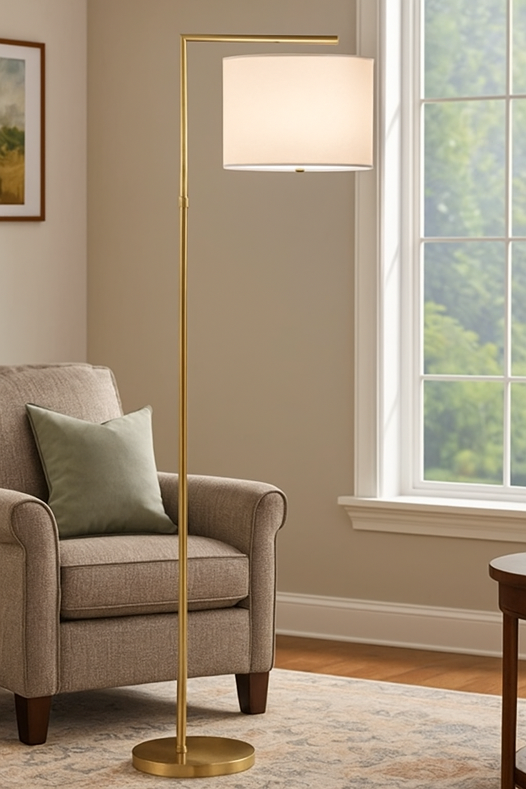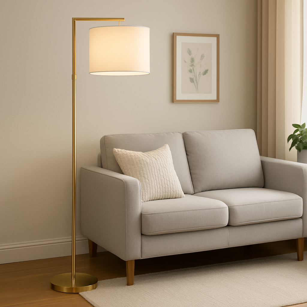 Lámpara portátil de pie con base de metal en acabado cobre mate. Su diseño elegante y sofisticado, con un diámetro de 325mm y altura de 1540mm, es ideal para crear una atmósfera cálida y moderna. Compatible con bombilla E27 (no incluida).