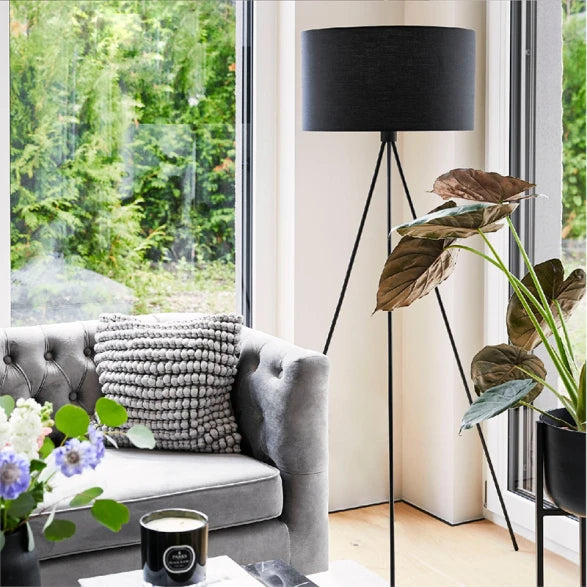 Lámpara portátil de pie con base de metal en color negro. Con un diámetro de 450mm y una altura de 1590mm, es perfecta para añadir un toque sofisticado a cualquier habitación. Compatible con bombilla E27 (no incluida), ideal para ambientes modernos y minimalistas.
