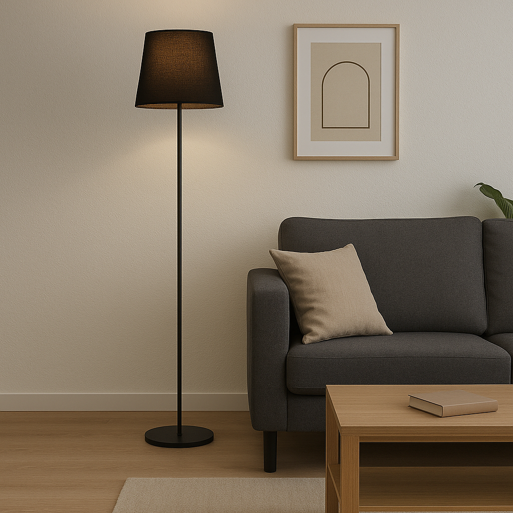 Lámpara portátil de pie con base de metal negro y pantalla textil. Su diseño elegante, con un diámetro de 325mm y altura de 1530mm, proporciona una luz cálida y envolvente. Compatible con bombilla E27 (no incluida), perfecta para iluminar espacios con estilo.