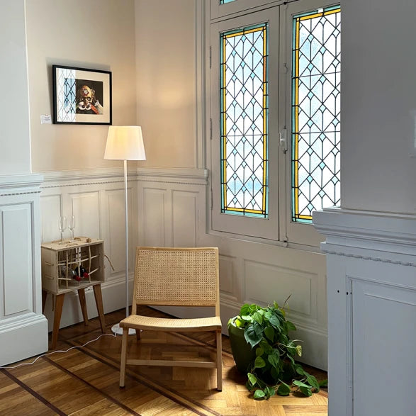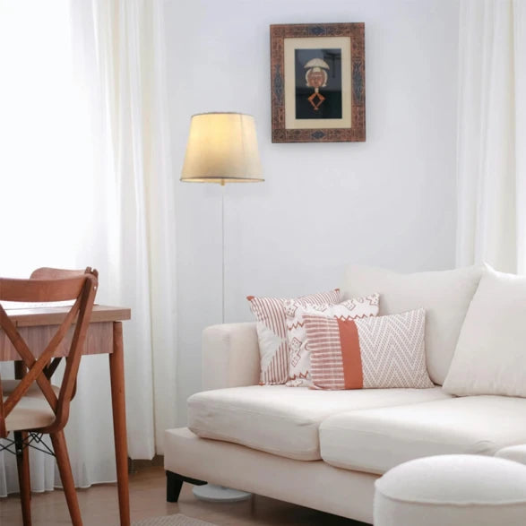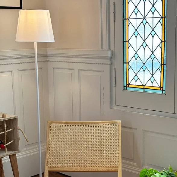 Lámpara portátil de pie con base de metal blanco y pantalla textil. Con un diámetro de 325mm y una altura de 1530mm, ofrece una luz suave y difusa que crea un ambiente acogedor. Compatible con bombilla E27 (no incluida), ideal para decoración de interiores.
