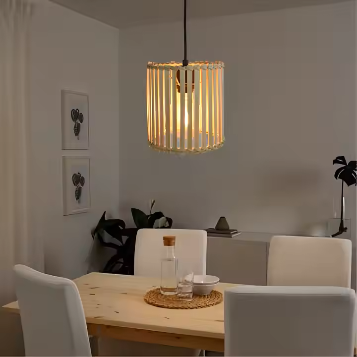 Colgante cilíndrico con varillas de bambú, base E27. Con un tamaño de 400x220mm, este colgante aporta un toque natural y elegante a cualquier espacio, ideal para áreas de estilo rústico o contemporáneo. Lamparita no incluida.