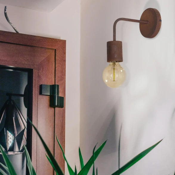 Aplique de pared con diseño industrial y detalles en óxido, ideal para ambientes rústicos y contemporáneos.