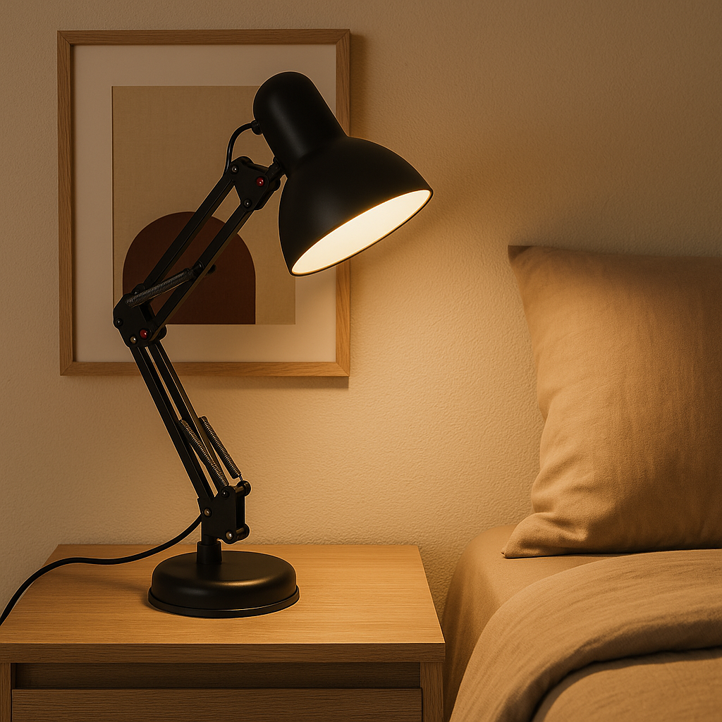 La Cambridge – Negra combina estética de estudio con un acabado negro mate que aporta carácter a escritorios y mesas de luz. Su brazo articulado con resortes y el cabezal orientable permiten dirigir la luz con precisión para trabajar, leer o estudiar. Construida en metal, utiliza portalámparas E27 y admite hasta 40 W (recomendado LED). Medidas aproximadas: D125 × W150 × H450 mm. Un clásico funcional, robusto y adaptable a cualquier ambiente.