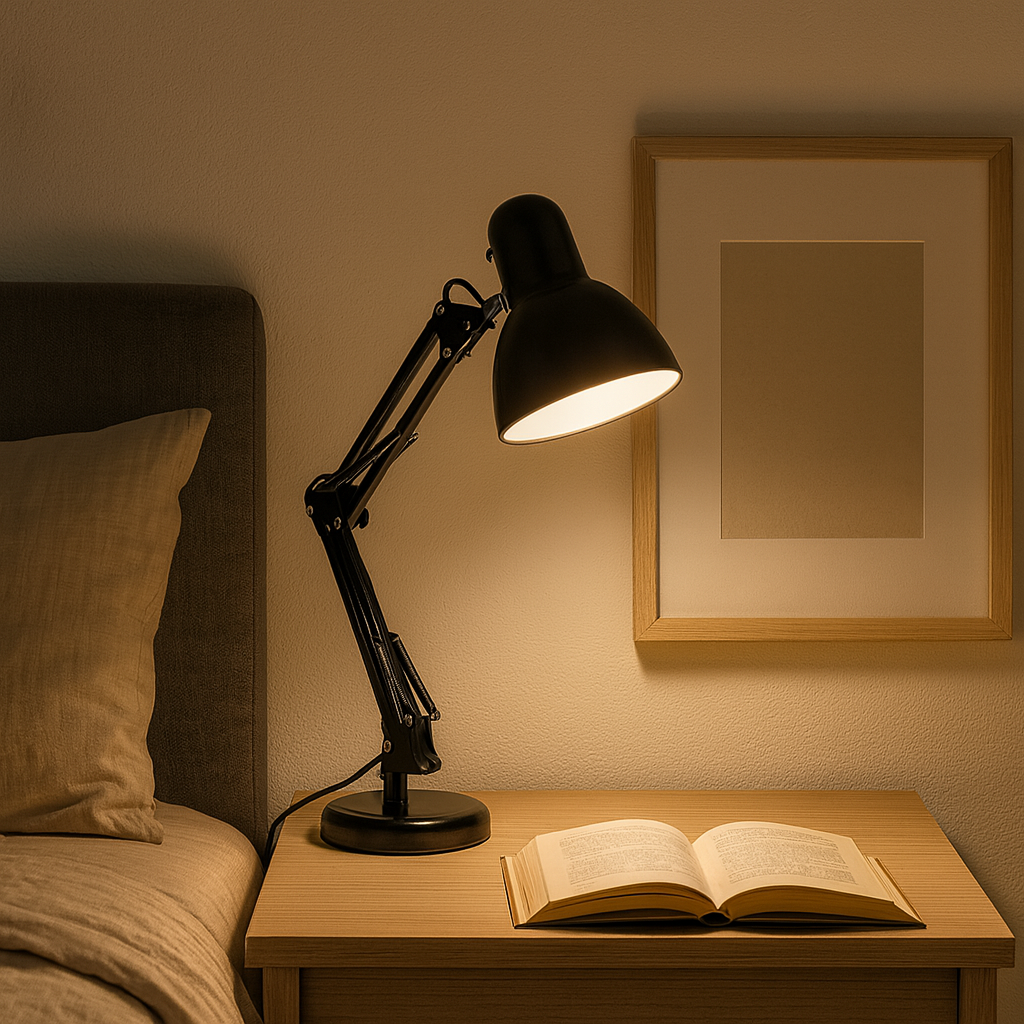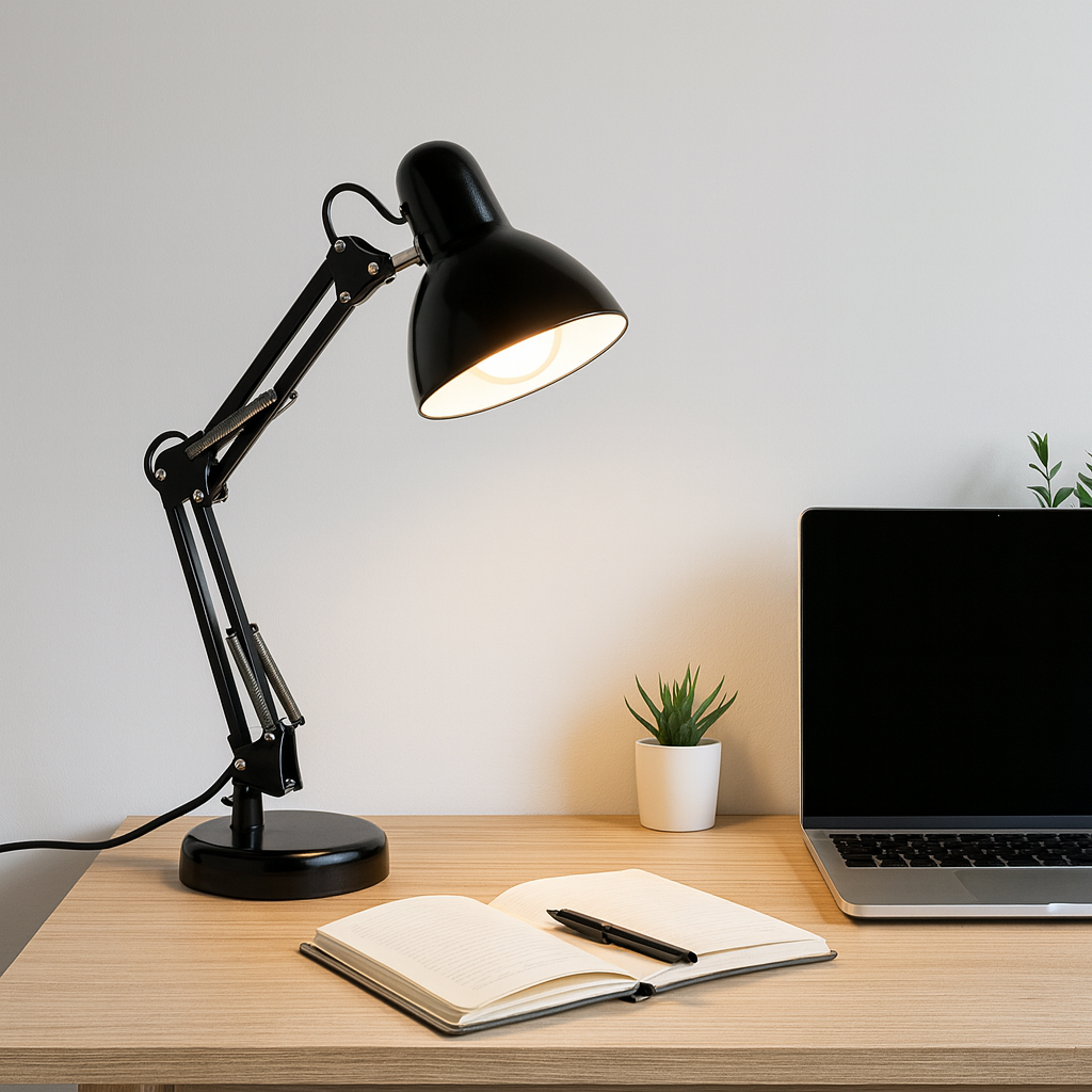 La Lámpara de Mesa BIL – Negra aporta estilo de estudio clásico y luz precisa para trabajar, leer o estudiar. Su diseño con brazo articulado y cabezal orientable permite dirigir el haz exactamente donde lo necesitás, mientras la pantalla en negro brillante reduce el deslumbramiento. Fabricada en PC + hierro, es resistente y estable sin perder ligereza visual. Funciona a 220–240 V y utiliza portalámparas E27 con LED hasta 11 W, ideal para eficiencia y bajo consumo. Medidas: alto 50 cm, ancho 33 cm, base Ø 15,7 cm. Un básico confiable y versátil para escritorio, mesita de noche o rincón creativo.