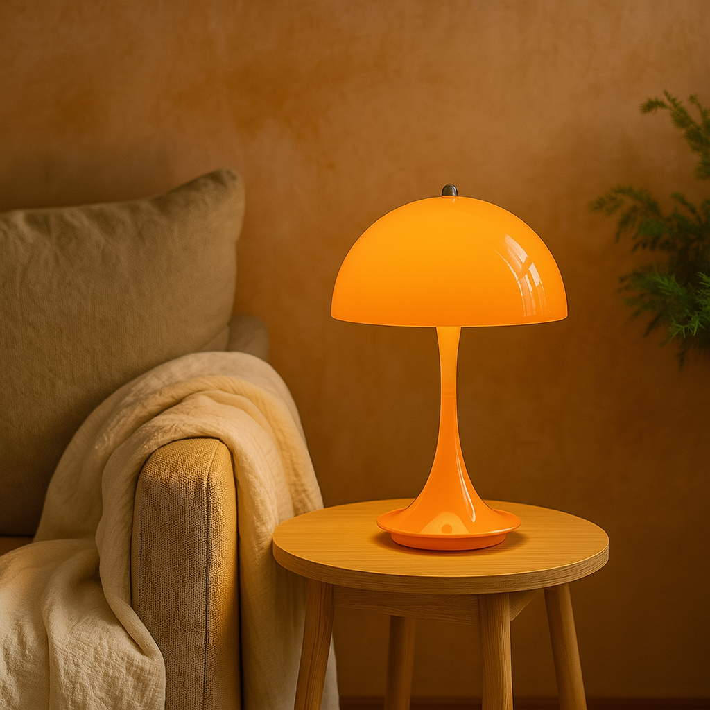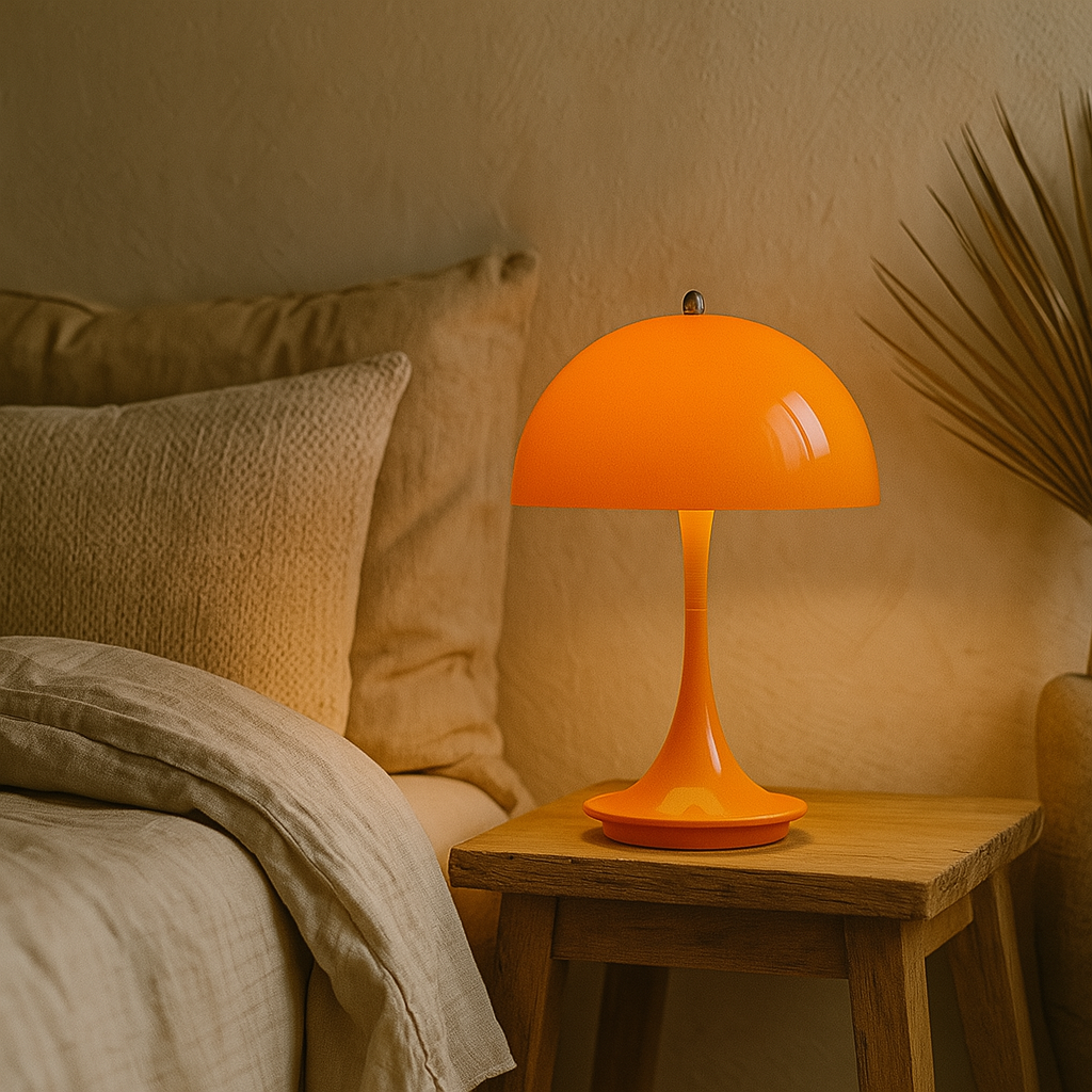 Lámpara de mesa portátil e inalámbrica de diseño moderno, tipo hongo. Con cuerpo metálico de color naranja/negra/rosada. Equipada con un sistema LED integrado, proporciona una iluminación cálida y confortable (3000K), perfecta para crear ambientes acogedores. Además, es dimerizable, lo que permite ajustar la intensidad luminosa según sus necesidades. Incluye una batería recargable de ion-litio, que se carga de manera práctica a través de un puerto USB.