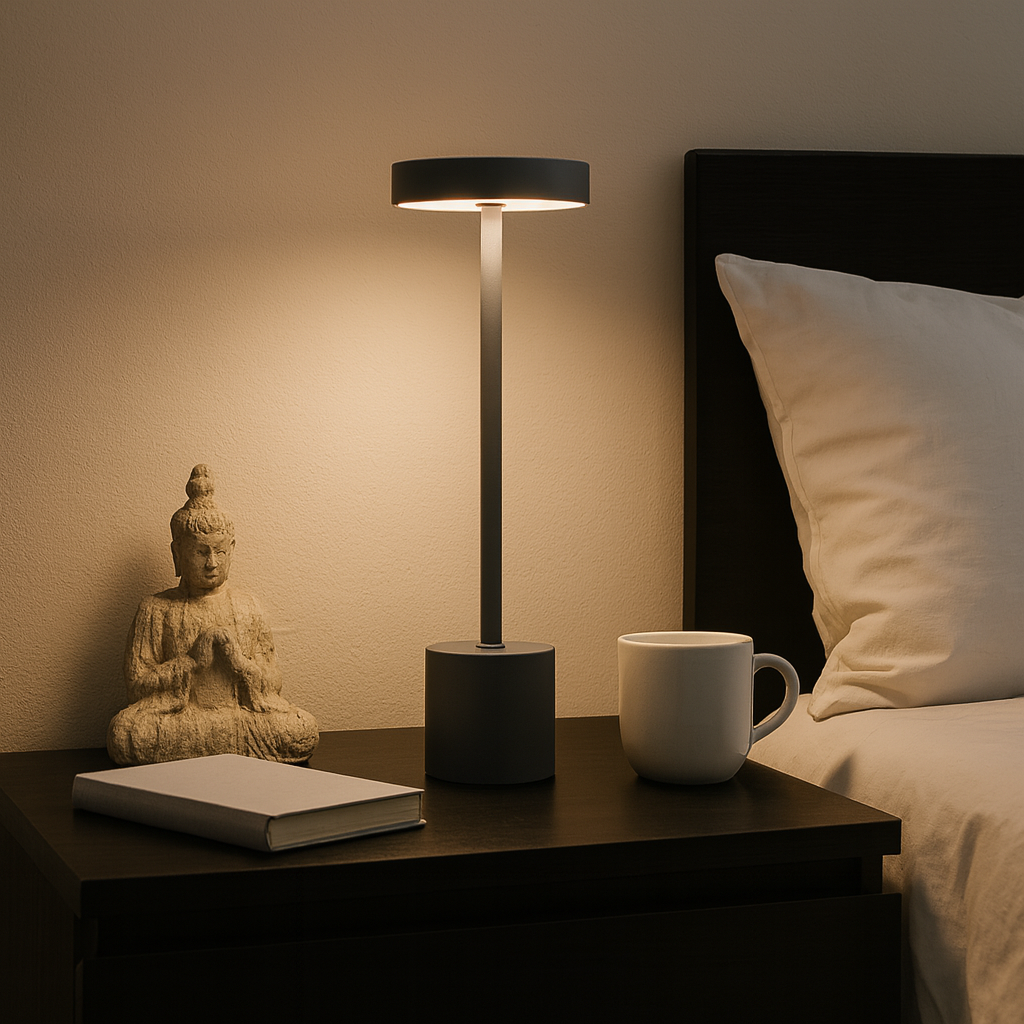 Lámpara de mesa NINI recargable DIMM – Grey. Diseño minimalista en gris con luz cálida y cabezal plano que distribuye la iluminación de forma uniforme. Incorpora LED de 5 W (150 lm) con tres niveles de brillo —suave, medio y completo— y protección IP52. La batería de 5200 mAh brinda entre 16 y 20 horas de uso y se recarga en 4–5 horas mediante USB-C. Vida útil del LED superior a 50.000 horas. Medidas: 35 × 8 × 7,4 cm. Ideal para mesa de noche, escritorio o rincones de lectura donde se busca practicidad sin cables.