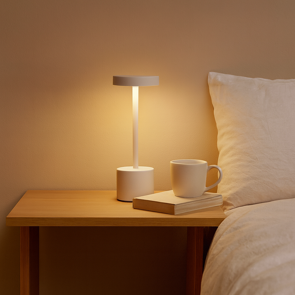 Lámpara de mesa NINI recargable DIMM en color white, de líneas minimalistas y luz cálida ideal para mesa de noche o escritorio. Incorpora LED de 5 W (150 lm) con tres niveles de brillo —luz tenue, media y completa— para adaptar la iluminación a cada momento. Su batería de 5200 mAh ofrece 16–20 horas de uso y se recarga en 4–5 h mediante cargador USB-C. Cuenta con protección IP52 y vida útil del LED >50.000 horas. Medidas: 34 × 8 × 7,4 cm. Una pieza ligera y resistente que combina diseño y funcionalidad en cualquier ambiente.