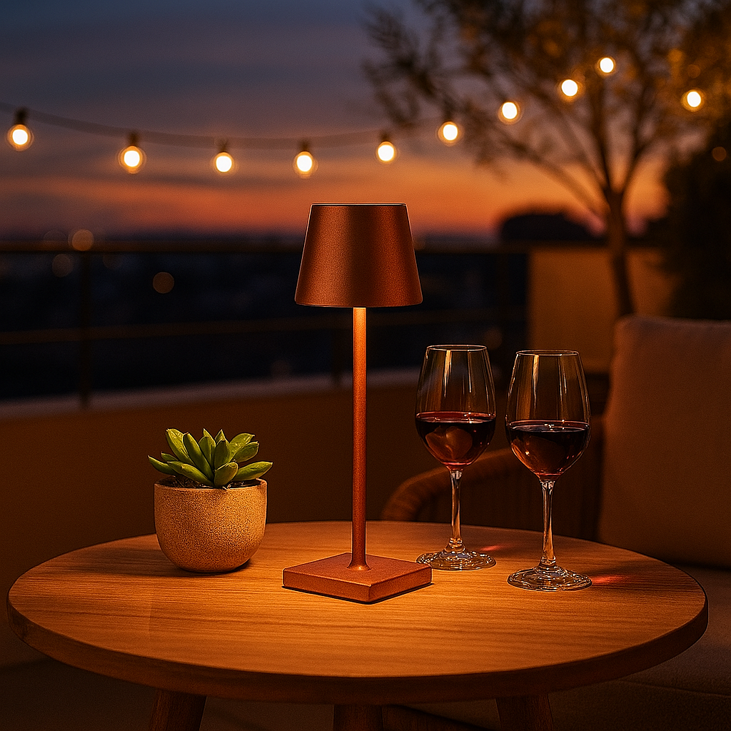 Diseño portátil y elegante que realza escritorios, mesitas de noche o terrazas sin necesidad de cables.