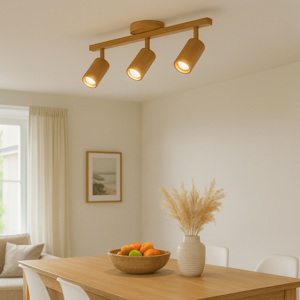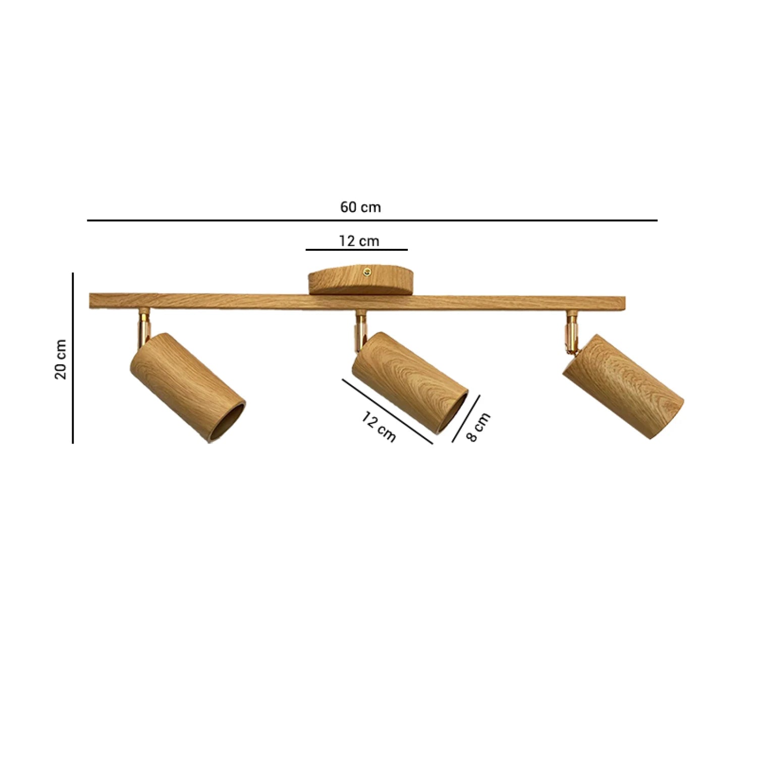 Barra de madera maciza con tres cabezales orientables para focos GU10, pensada para montar al techo y dirigir la luz justo donde la necesitás. Su estética cálida y minimalista combina con cocinas, pasillos, livings o barras, aportando acentos de luz funcional sin perder armonía visual. Fabricada en madera real tanto en el canopy como en los brazos y pantallas, ofrece un acabado natural y duradero. Dimensiones: 60 cm de largo × 20 cm de alto. Tipo: ceiling lamp / adosada. Compatible con lámparas LED GU10 (no incluidas). Si querés, te genero dos imágenes en ambiente a escala para la ficha.