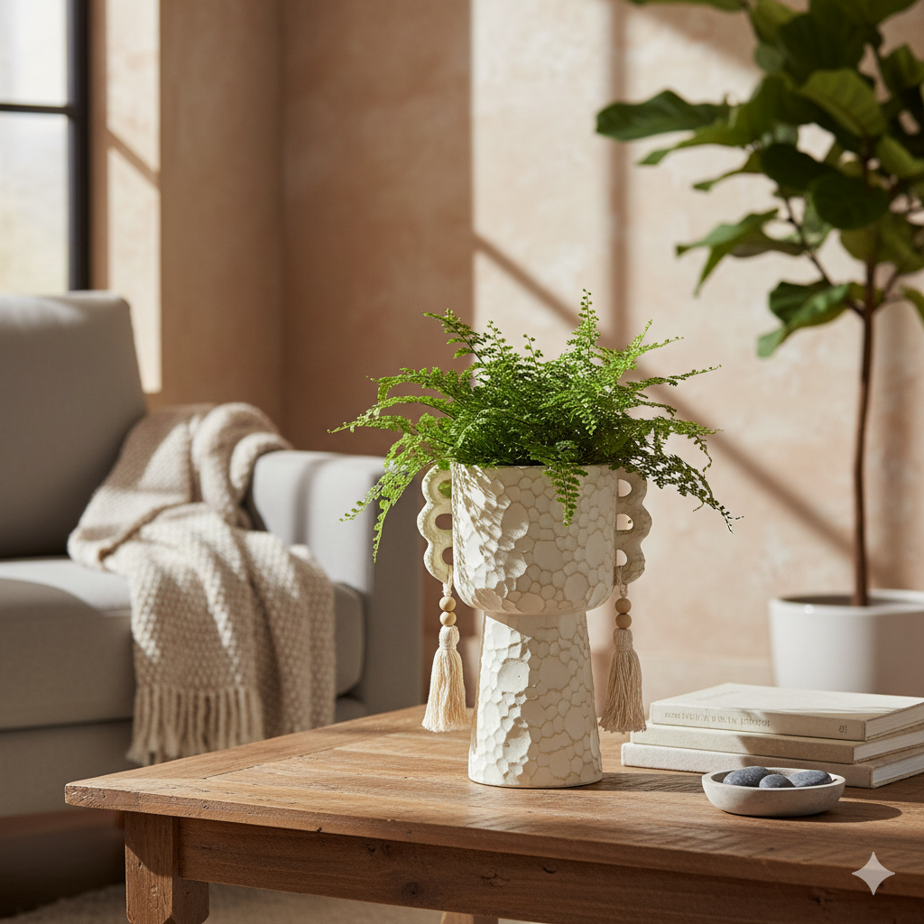 Incorpora un toque de calidez a tu entorno con esta maceta con borlas, creada para quienes priorizan la excelencia en cada detalle. Sus medidas aproximadas son 18x13x.