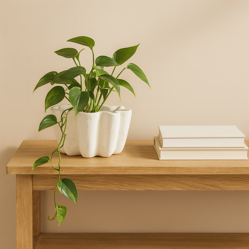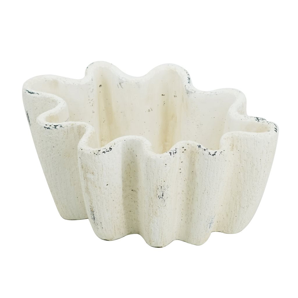 Maceta Forma Orgánica. Pieza decorativa de acabado piedra en tono marfil, con bordes ondulados y silueta escultural que aporta movimiento y textura a estantes, consolas o mesas auxiliares. Ideal como cubre–maceta para plantas de follaje colgante o suculentas; también puede usarse con una maceta plástica interna para facilitar el riego. Mantenimiento sencillo: limpiar con paño seco o ligeramente humedecido y evitar la exposición solar directa prolongada. Medidas aproximadas: Ø 26 cm x alto 18,5 cm.