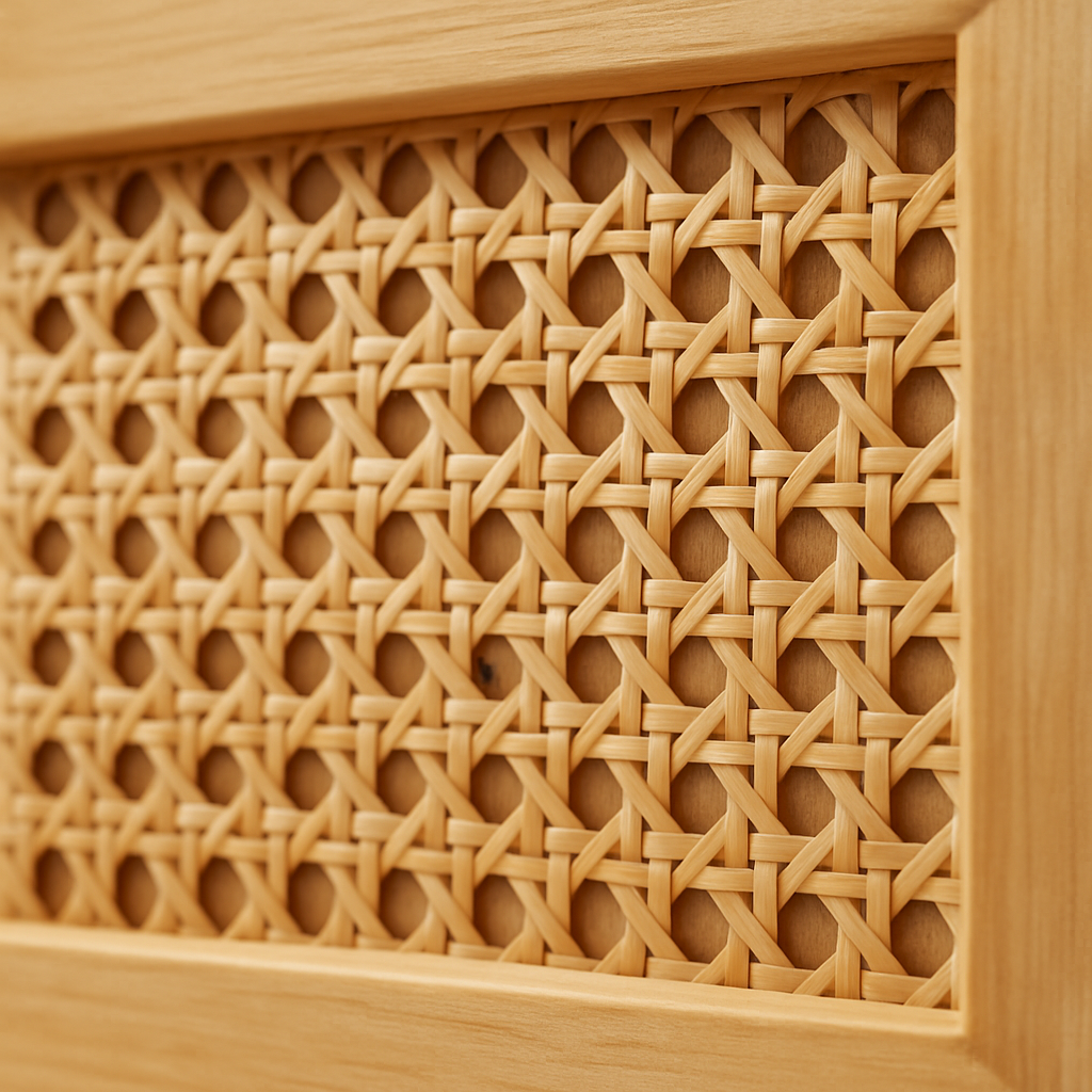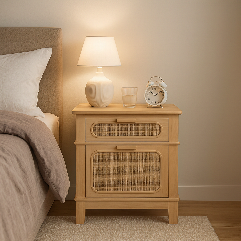 La Mesa de Luz con Ratán combina la calidez de la madera en tono natural con el encanto texturado del ratán tejido en su puerta frontal. Su diseño limpio y atemporal se adapta a dormitorios nórdicos, mediterráneos o boho, aportando un acento orgánico que suma luz y materialidad. Cuenta con un cajón superior para lo cotidiano (gafas, cargadores, libretas) y un compartimento con puerta de ratán ideal para libros o textiles pequeños. Terminación suave al tacto, tiradores discretos y patas firmes que elevan la pieza con proporción equilibrada.