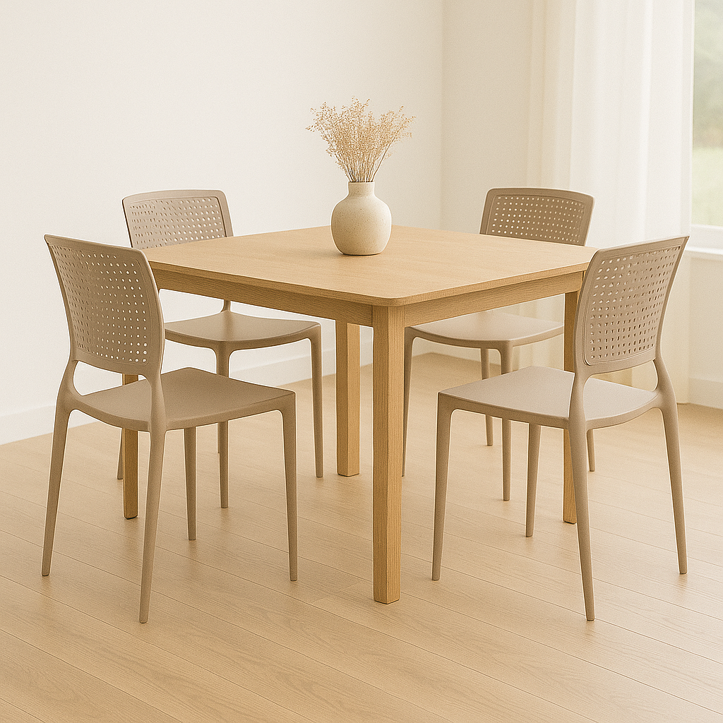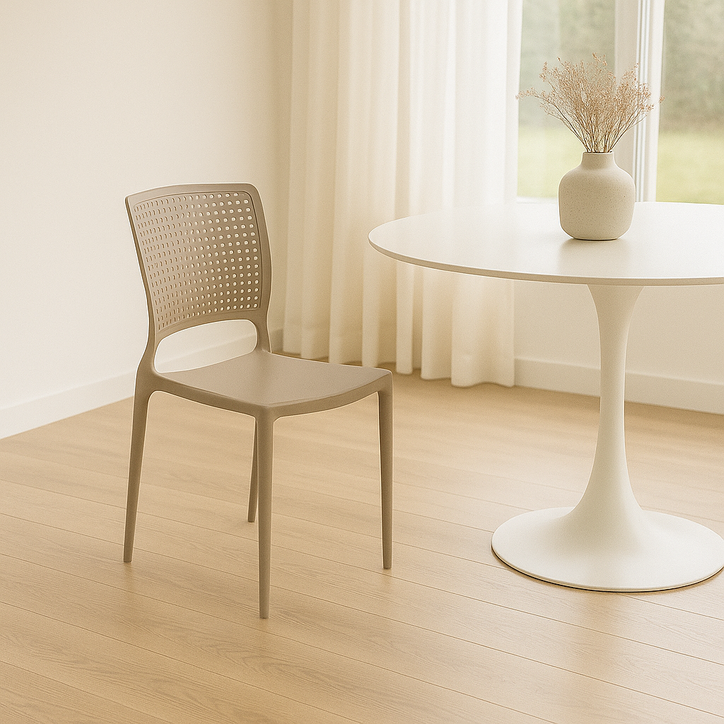 SILLA APILABLE GAMUZA "SAFIRA" REPALDO CALADO Silla apilable con elegante acabado en gamuza y respaldo calado, perfecta para un look sofisticado en cualquier espacio.Dimensiones aproximadas: ancho 440mm, altura 845mm (incluido respaldo), profundidad 525mm. Altura del asiento: 450mm.