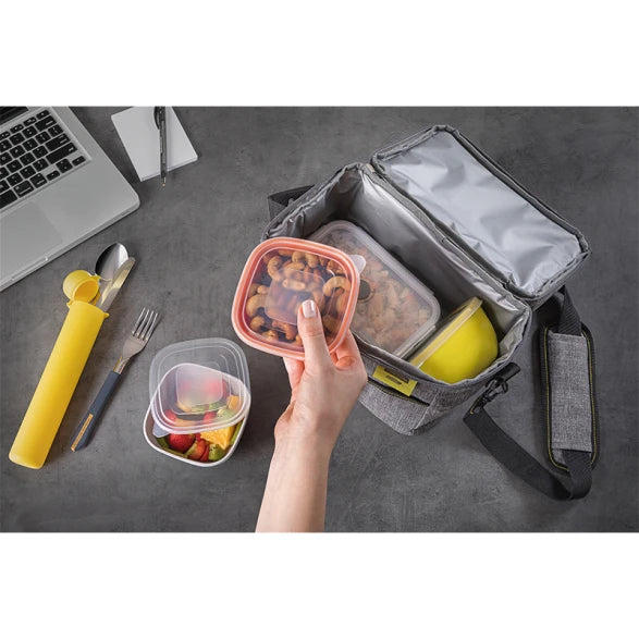 - El juego esta compuesto por: * 1 bolsa térmica de poliéster con 5 compartimentos, amplio espacio interno, cierre con zíper y asa extraíble. Puede usarlo con el asa de mano o de hombro. * 1 Estuche de polipropileno para los cubiertos. * 3 cubiertos con láminas de acero inoxidable y mangos de polipropileno (tenedor, cuchara y chuchillo de sierra). * 3 Potes con tapas transparente de polipropileno. 1 Pote retráctil de silicona con tapa de polipropileno.