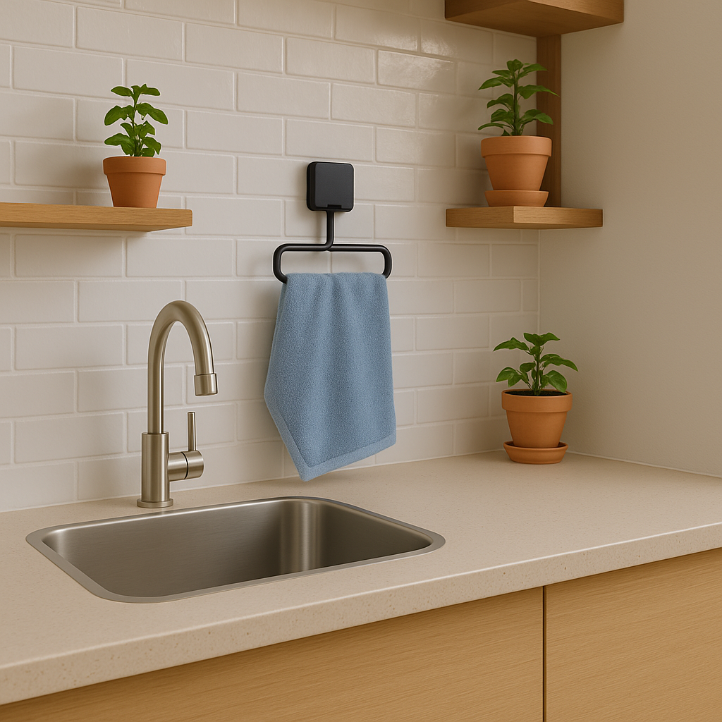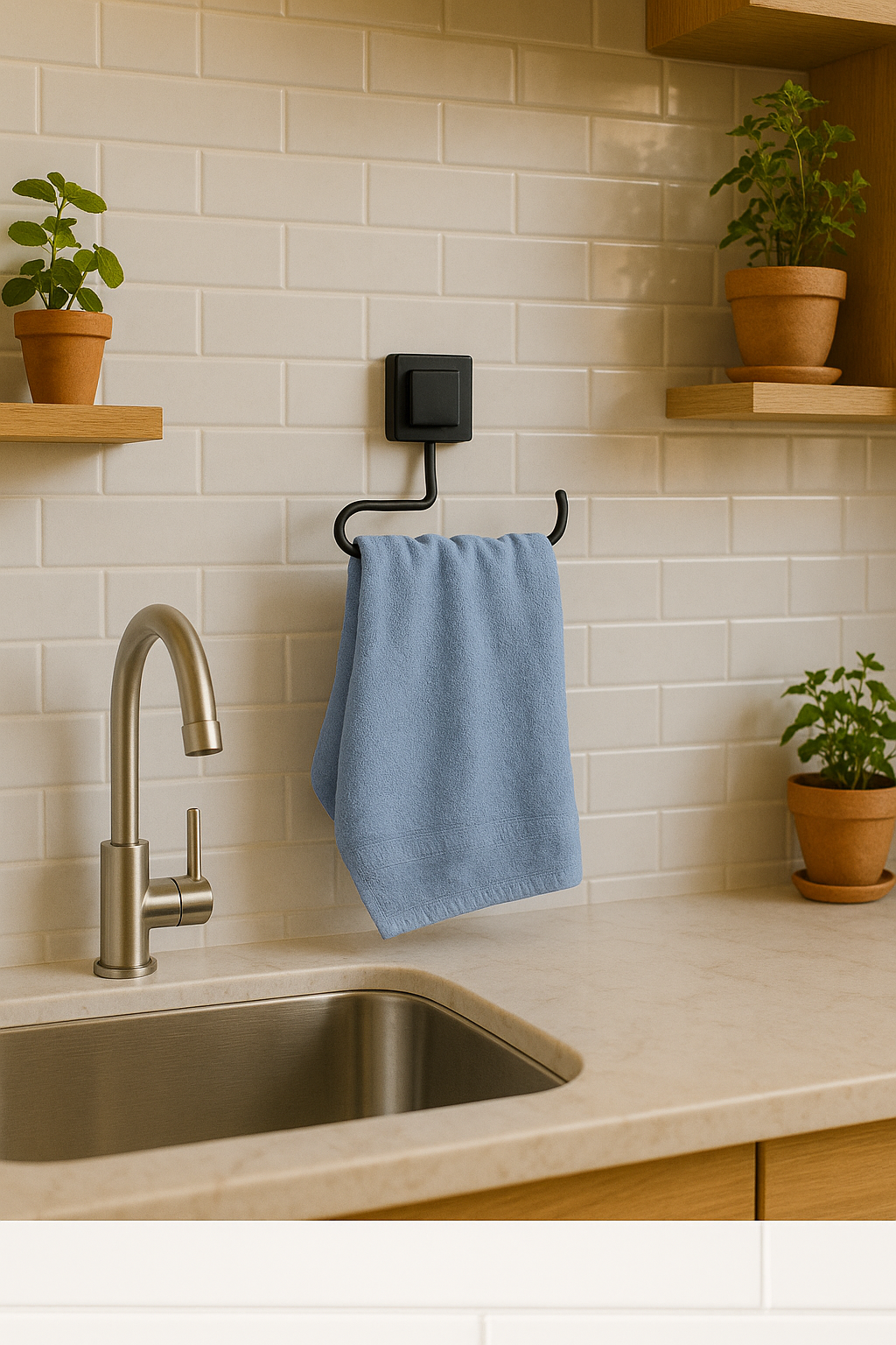 Toallero adhesivo cuadrado negro. Diseño moderno, sin necesidad de taladro.